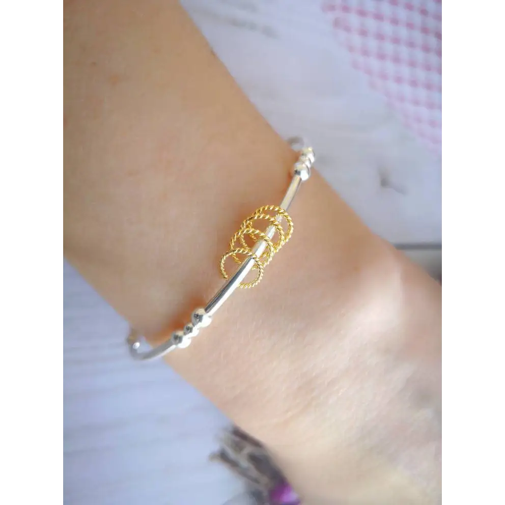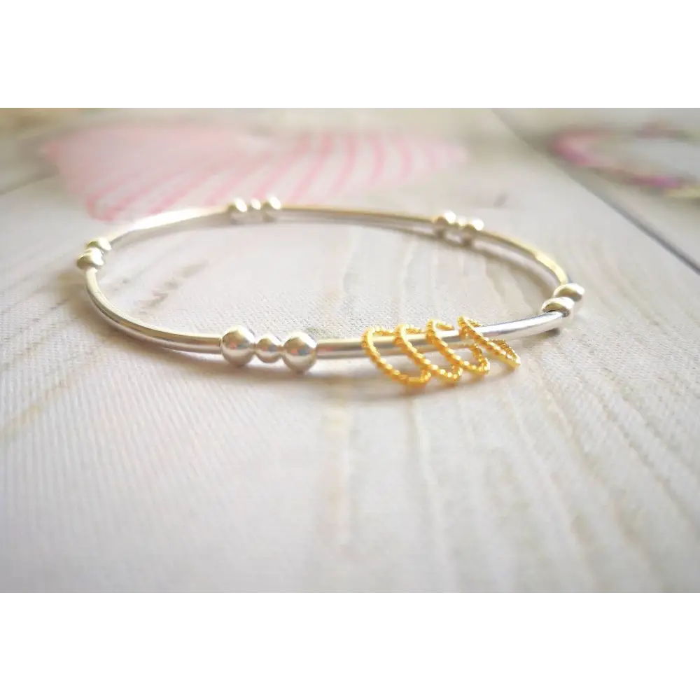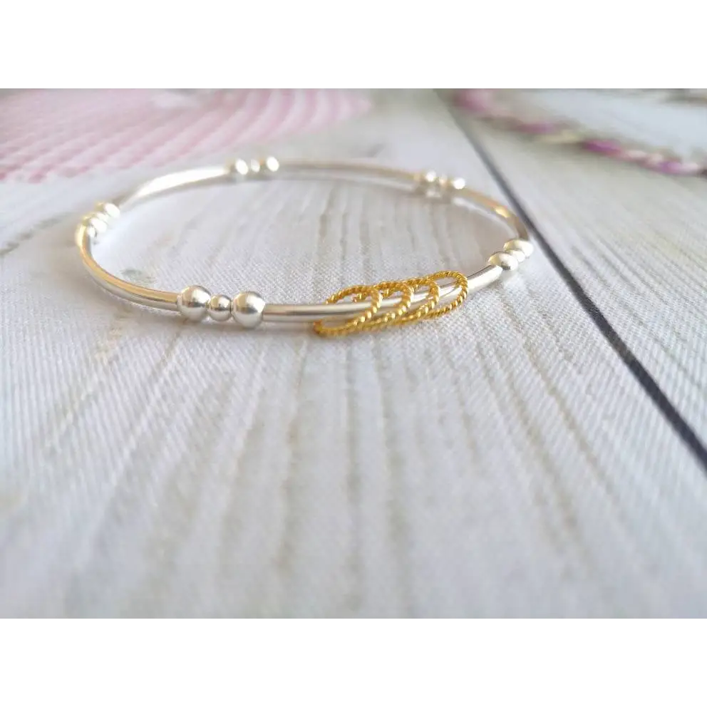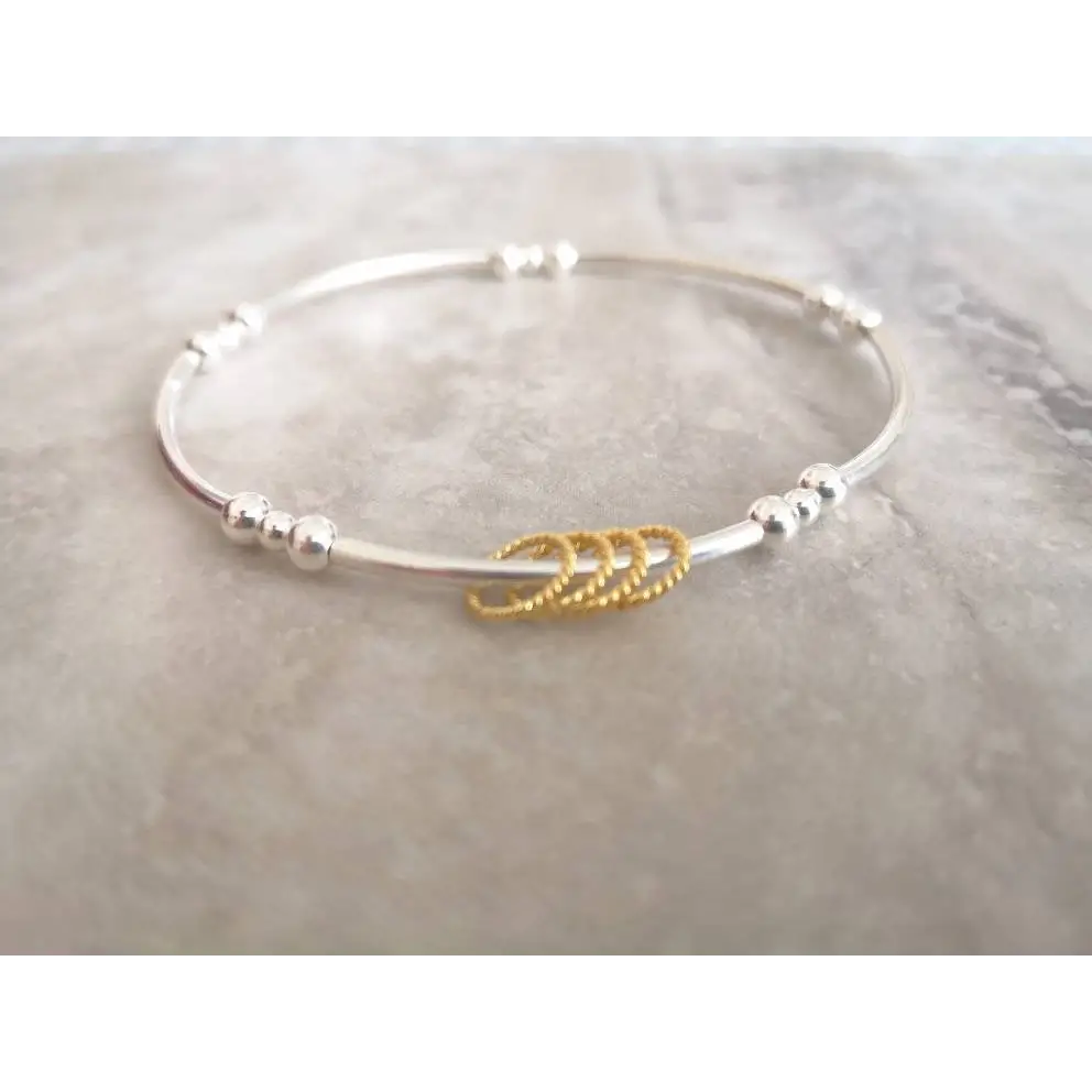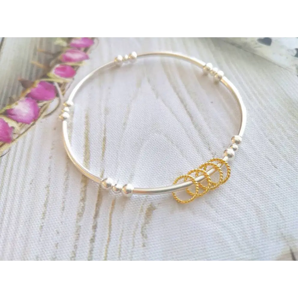 This bracelet is meticulously handcrafted using high-quality sterling silver noodle/tube beads and eye-catching yellow gold vermeil twisted rings. The bracelet is strung on professional-grade stretch elastic, ensuring both durability and a comfortable fit. The gold rings move freely around the bracelet, creating a subtle and graceful shimmer.