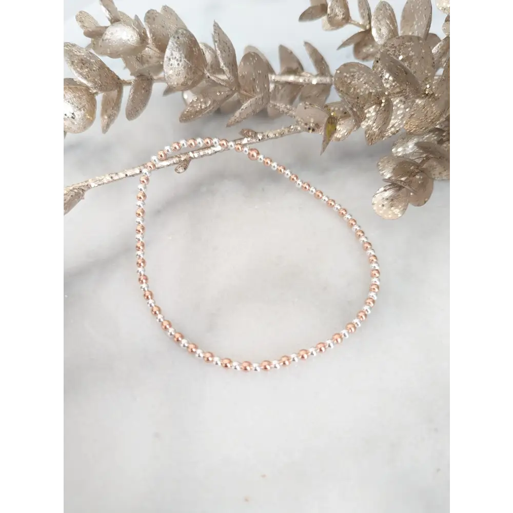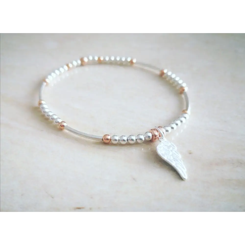 Made with a mix of 3mm sterling silver and rose gold vermeil beads and 4 mini noodle beads, completed with a 16mm sterling silver angel wing.