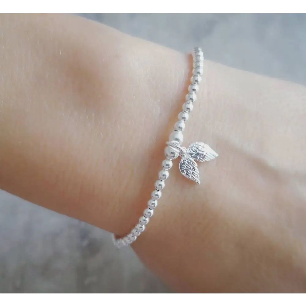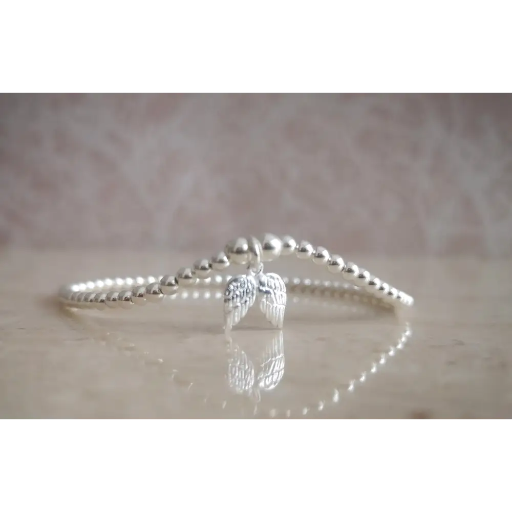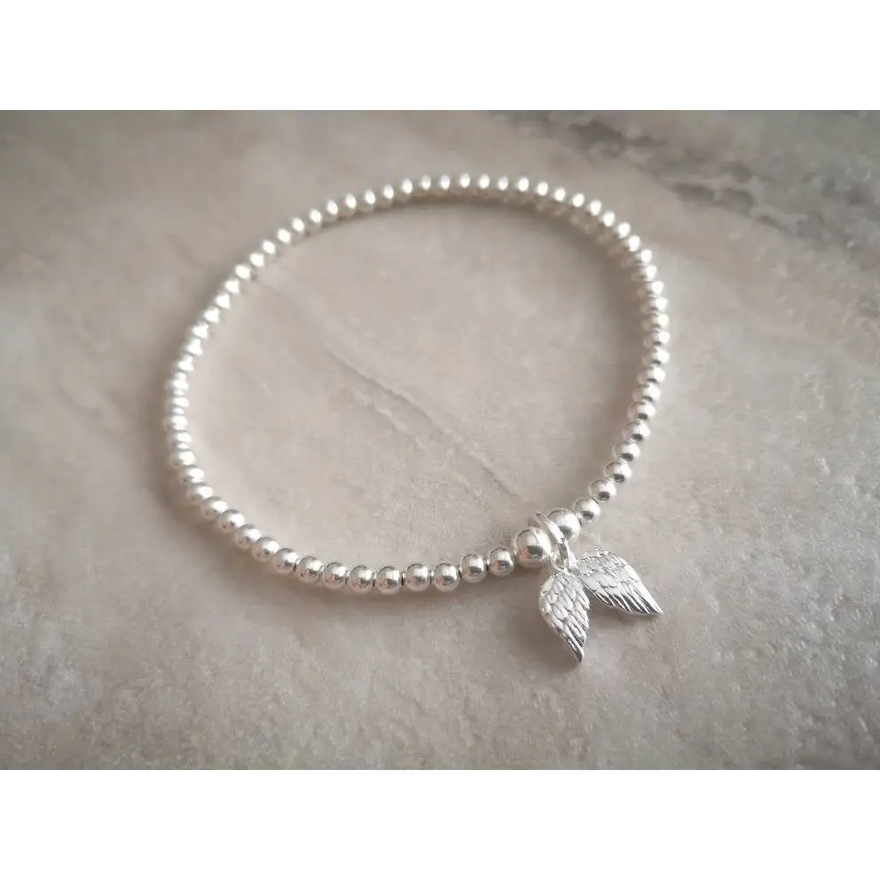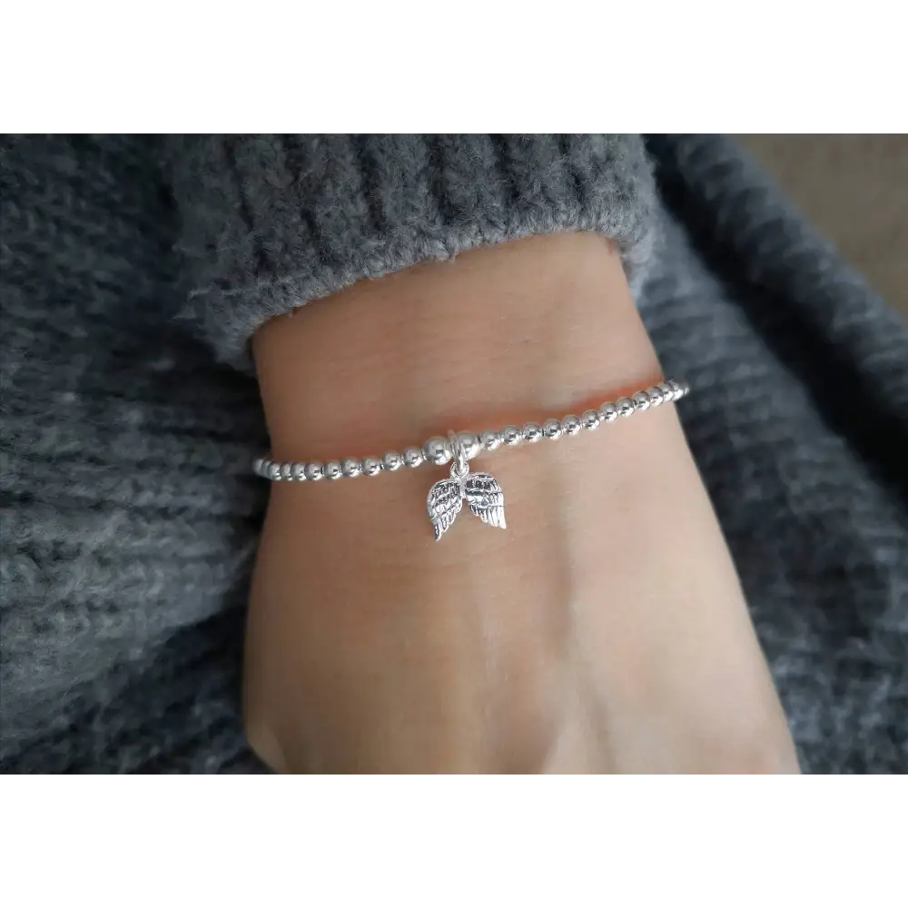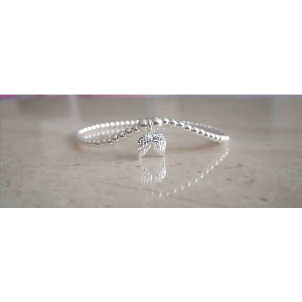 This delicate bracelet or anklet features shimmering 3mm sterling silver beads, meticulously strung together to create a piece that's both elegant and comfortable to wear. At its heart lies a beautifully detailed 9x10mm sterling silver angel wings charm, a symbol of guidance, protection, and hope. The charm adds a touch of ethereal beauty to this already exquisite piece, making it a meaningful addition to any jewelry collection. This bracelet is approximately 7 inches in length.