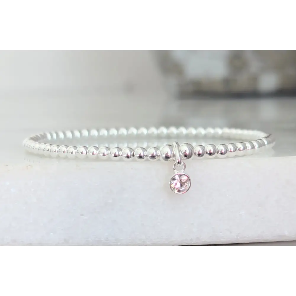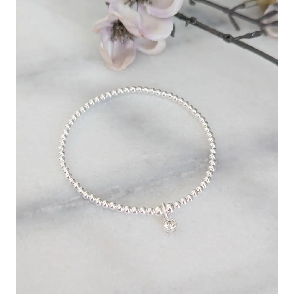 Crafted with smooth 3mm sterling silver beads and featuring a delicate silver encased crystal stone, this bracelet offers a subtle yet sophisticated sparkle. The high-quality sterling silver ensures lasting shine and durability.