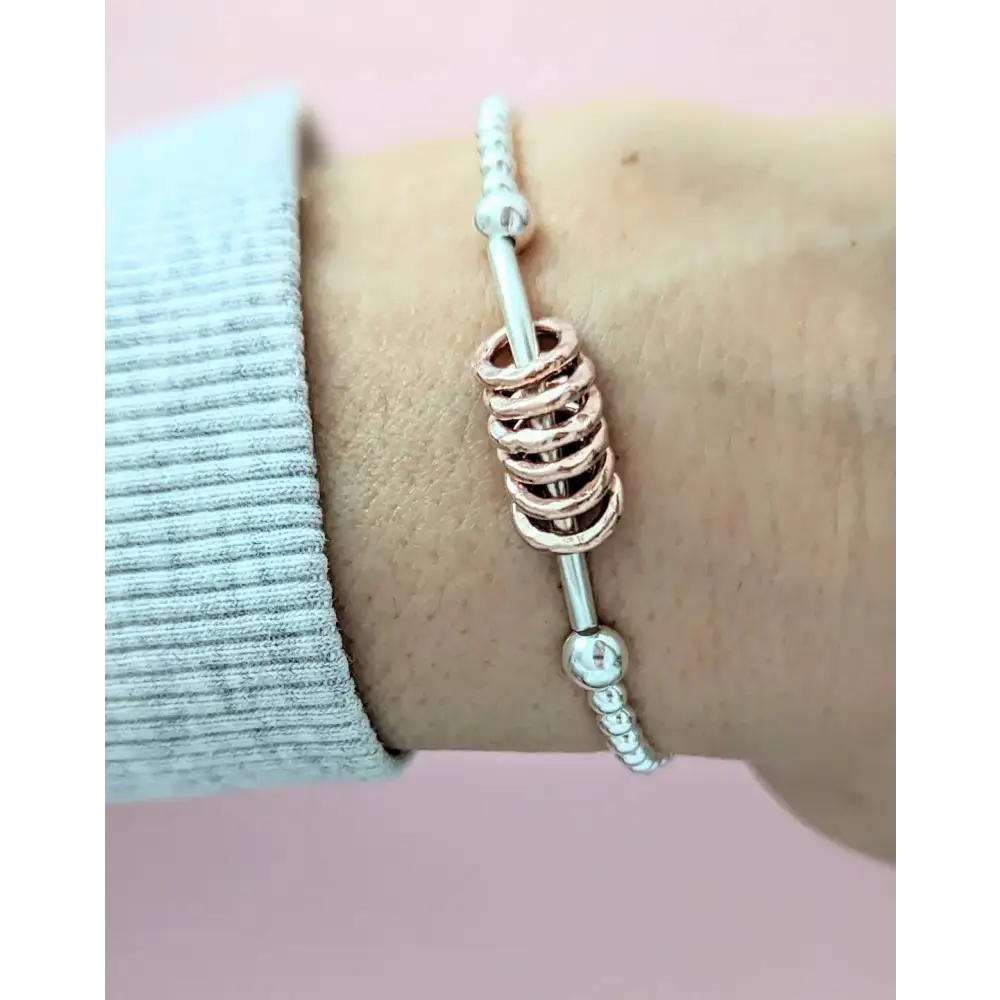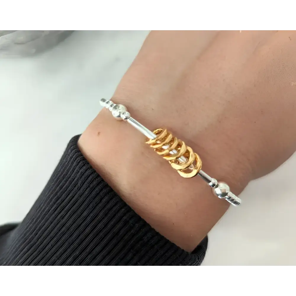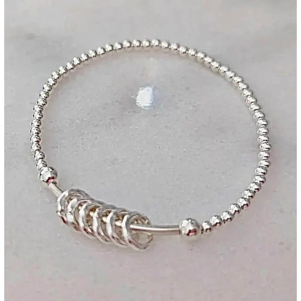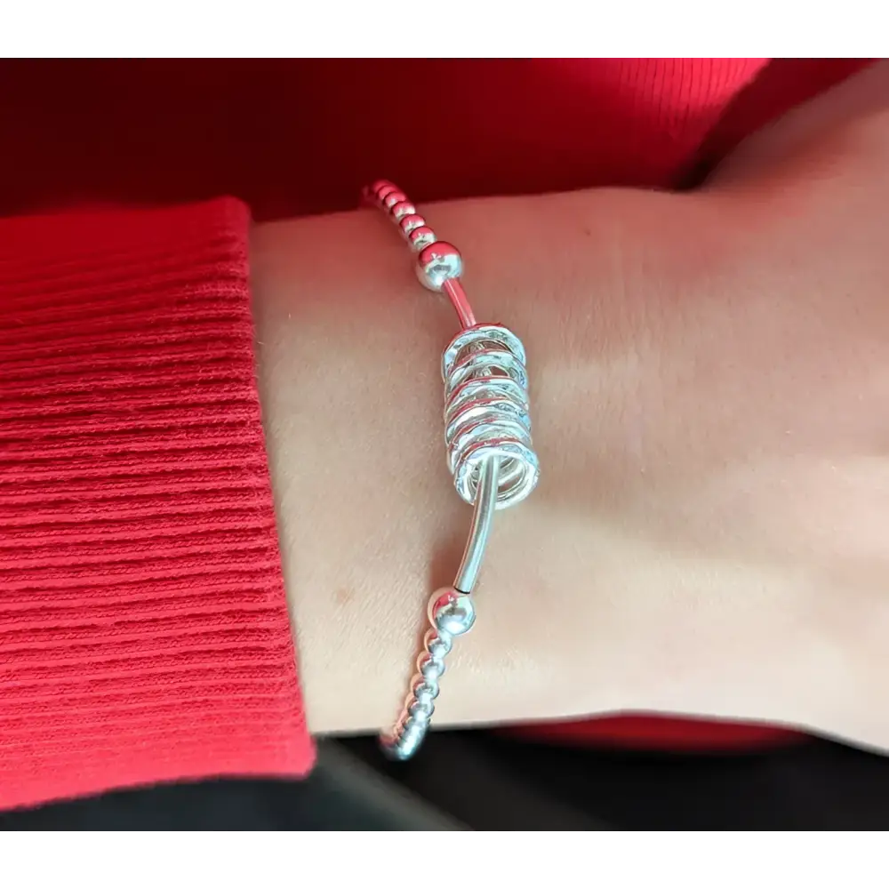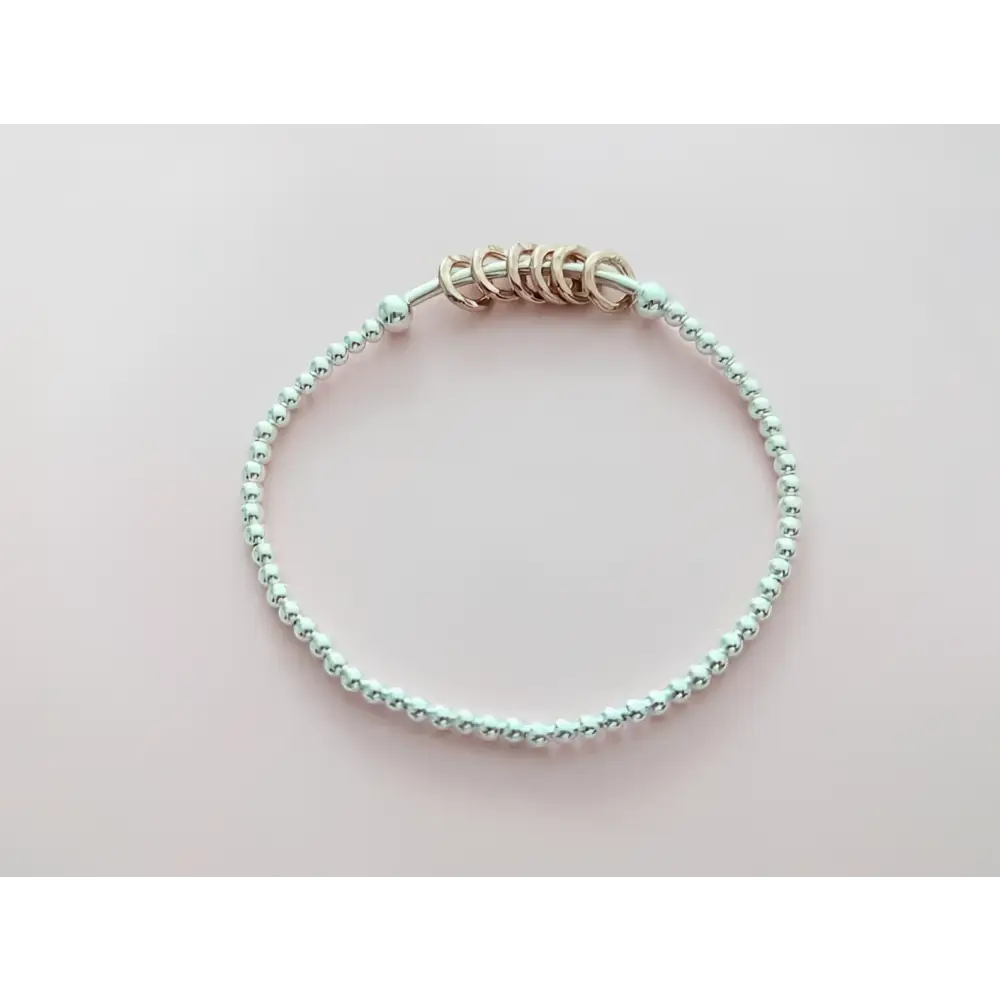 Celebrate every milestone birthday with this stunning bracelet, a beautiful and meaningful way to mark life's significant chapters. Each ring on this elegant piece represents an amazing decade, creating a tangible reminder of cherished memories and accomplishments. This milestone birthday bracelet is meticulously handcrafted with 3mm sterling silver beads, known for their quality and shine, and features eye-catching sterling silver hammered rings that add a touch of texture and sophistication. The rings move freely along the sleek noodle bead, creating a subtle and graceful movement.