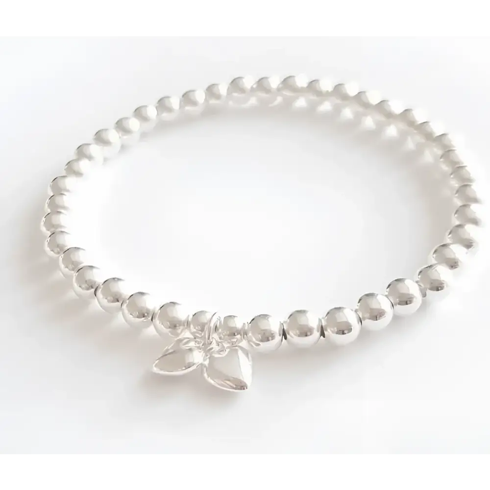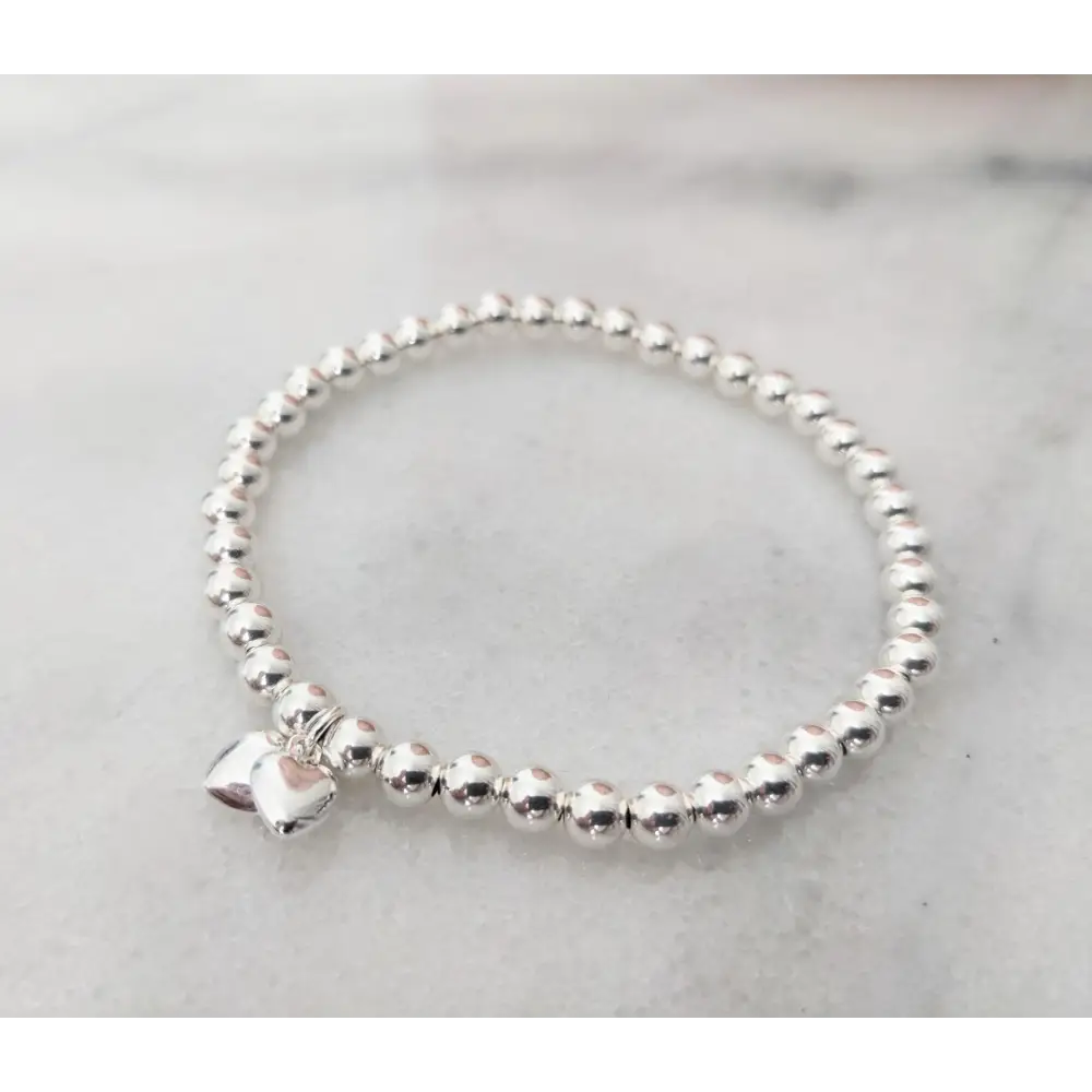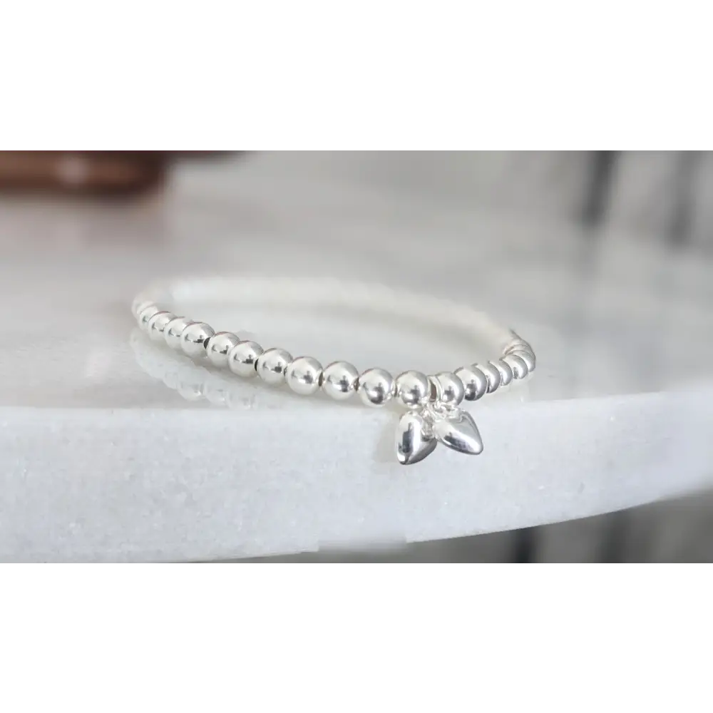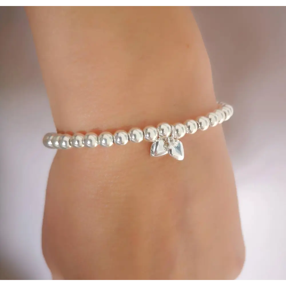 This beautiful bracelet features delicate 5mm sterling silver beads, carefully strung together to create a timeless piece. Adorning the bracelet are two charming sterling silver 9mm x 6mm puffed heart charms, gracefully suspended on a secure 5mm closed jump ring. The use of professional stretch cord ensures comfortable wear and lasting durability.