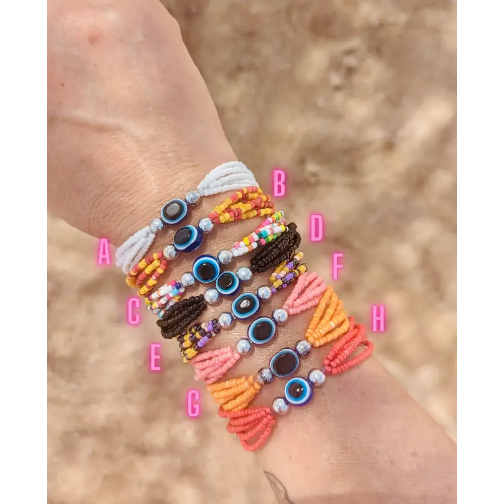 An adjustable, seed beaded, evil eye bracelet or anklet, made with 2mm seed beads.