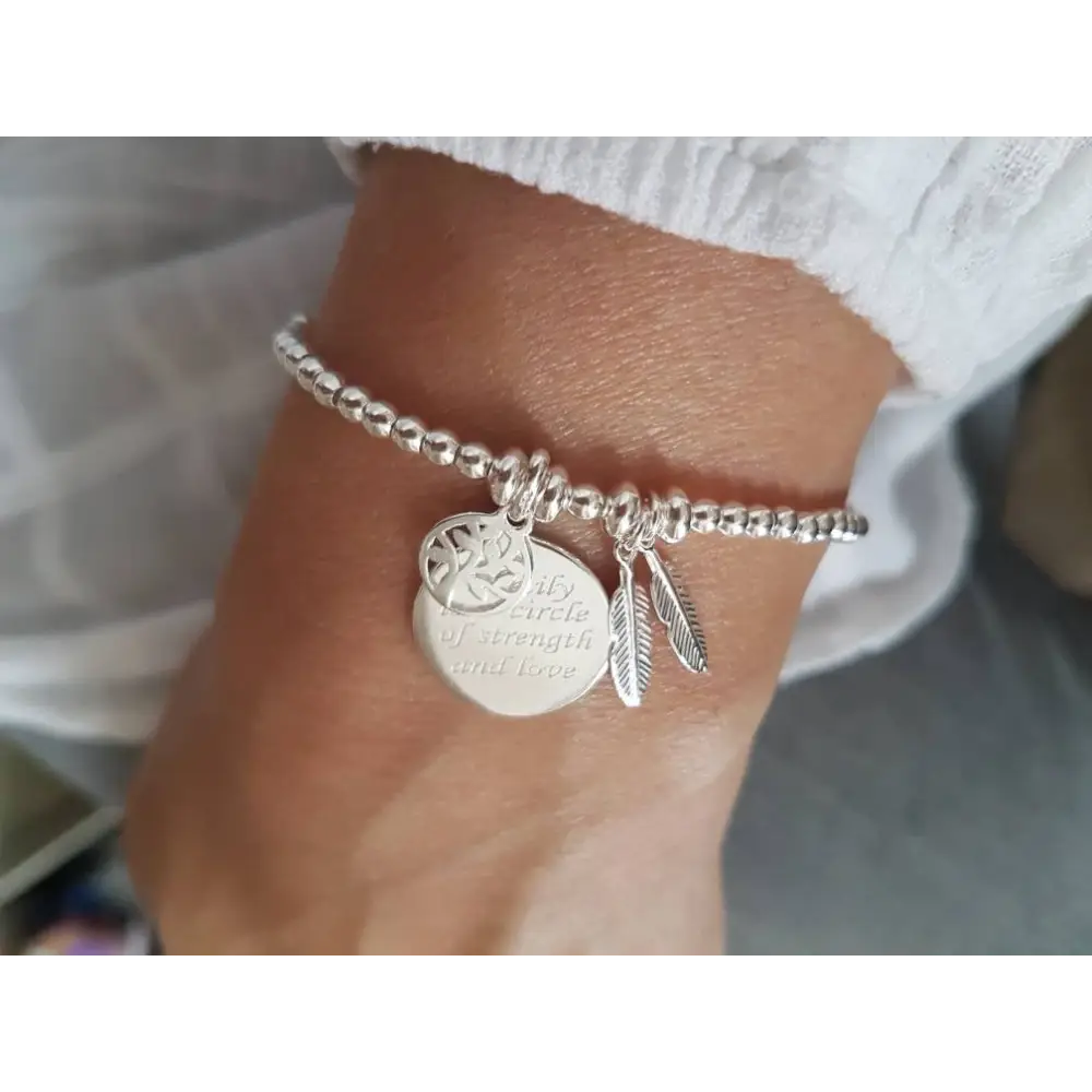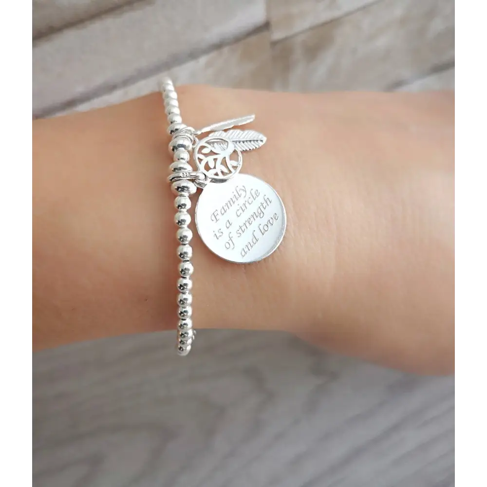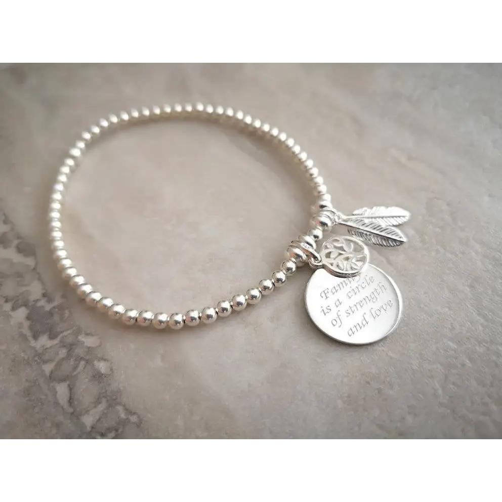 This delicate bracelet features 3mm sterling silver beads, creating a subtle and elegant look. The charming sterling silver charm, depicting the Tree of Life, measures 12mm and symbolizes family bonds and growth. This is a lovely silver family bracelet.