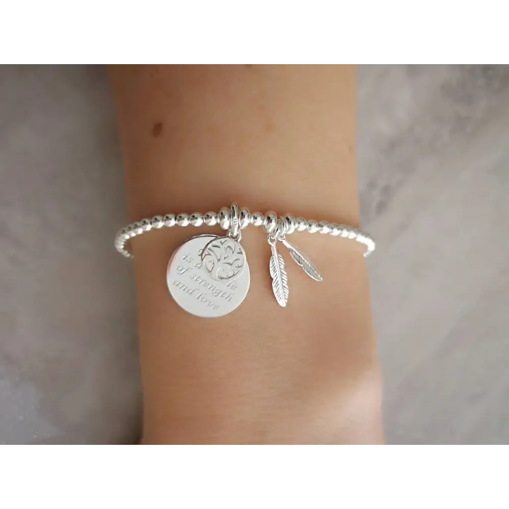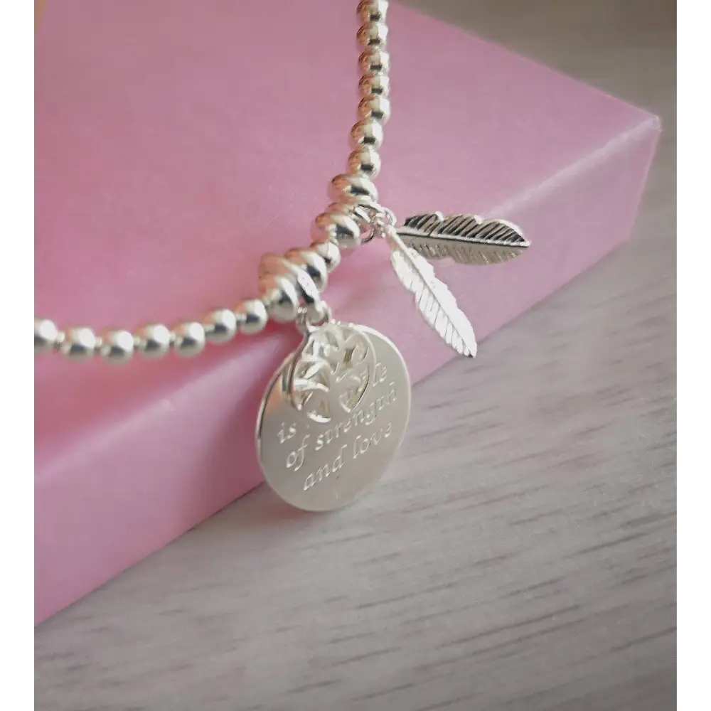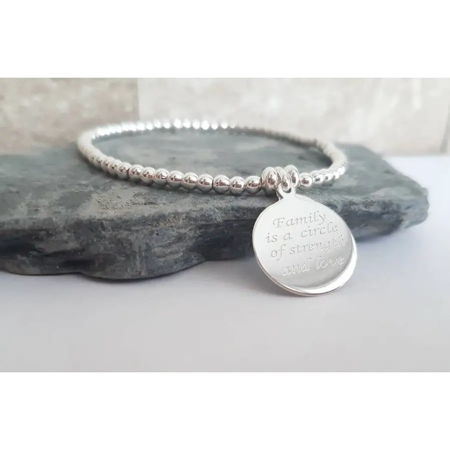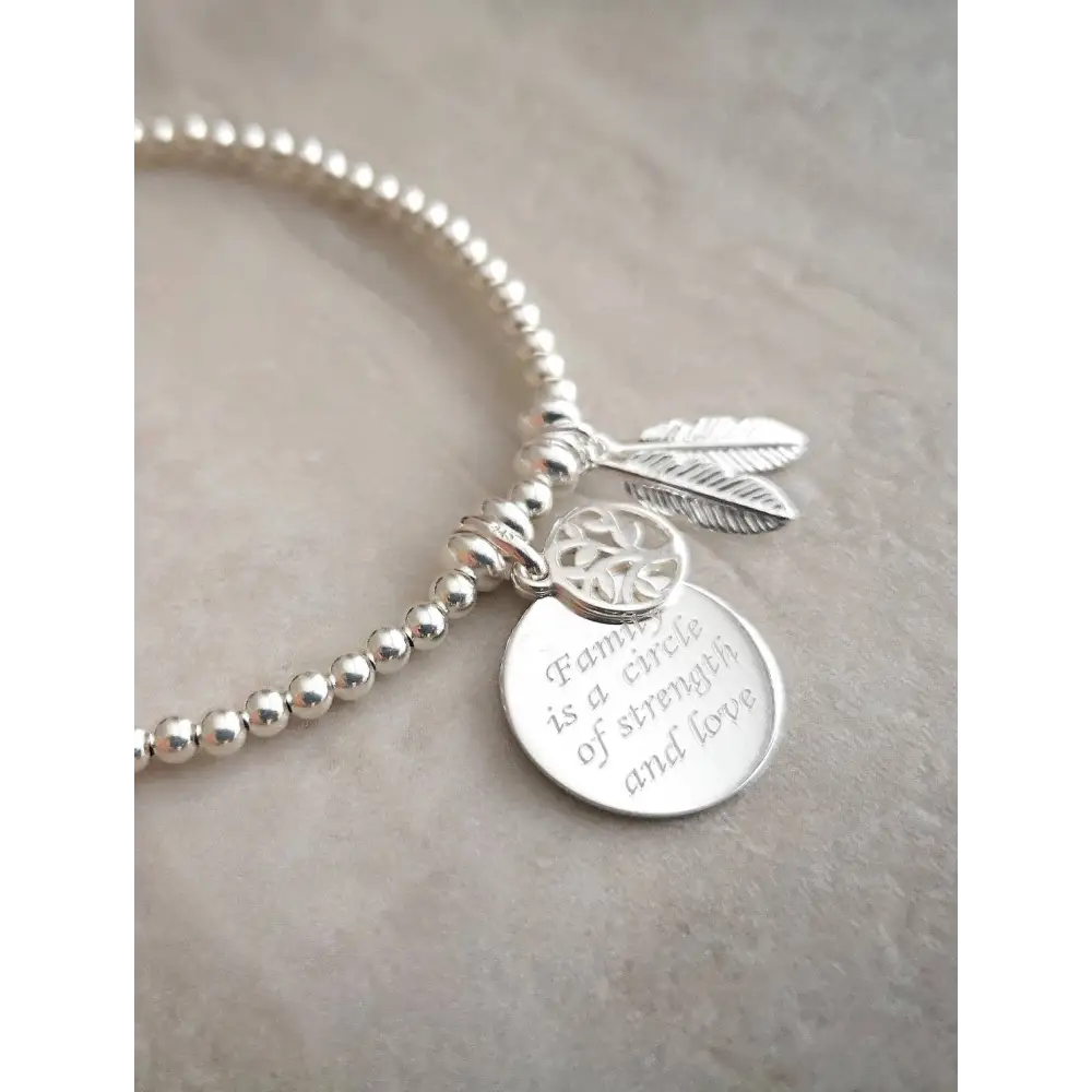 This delicate bracelet features 3mm sterling silver beads, creating a subtle and elegant look. The charming sterling silver charm, depicting the Tree of Life, measures 12mm and symbolizes family bonds and growth. This is a lovely silver family bracelet.