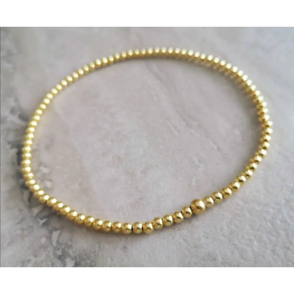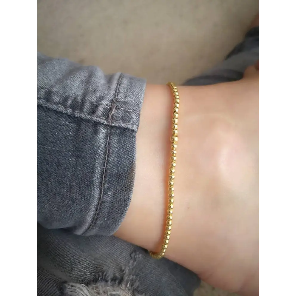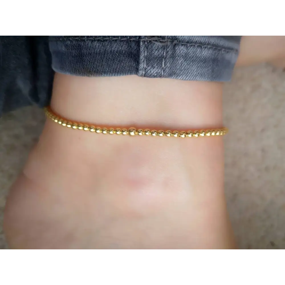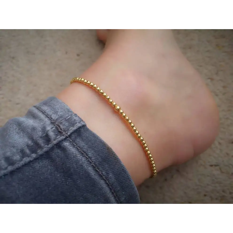 This beaded stretch anklet features delicate 3mm gold vermeil beads strung on durable stretch elastic, offering both beauty and comfortable wear. The high-quality vermeil provides the rich look of gold with a lasting finish.