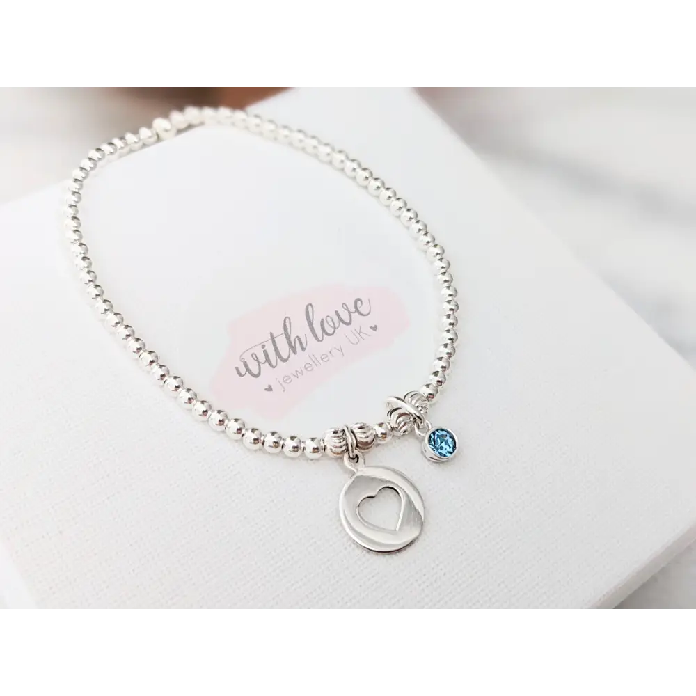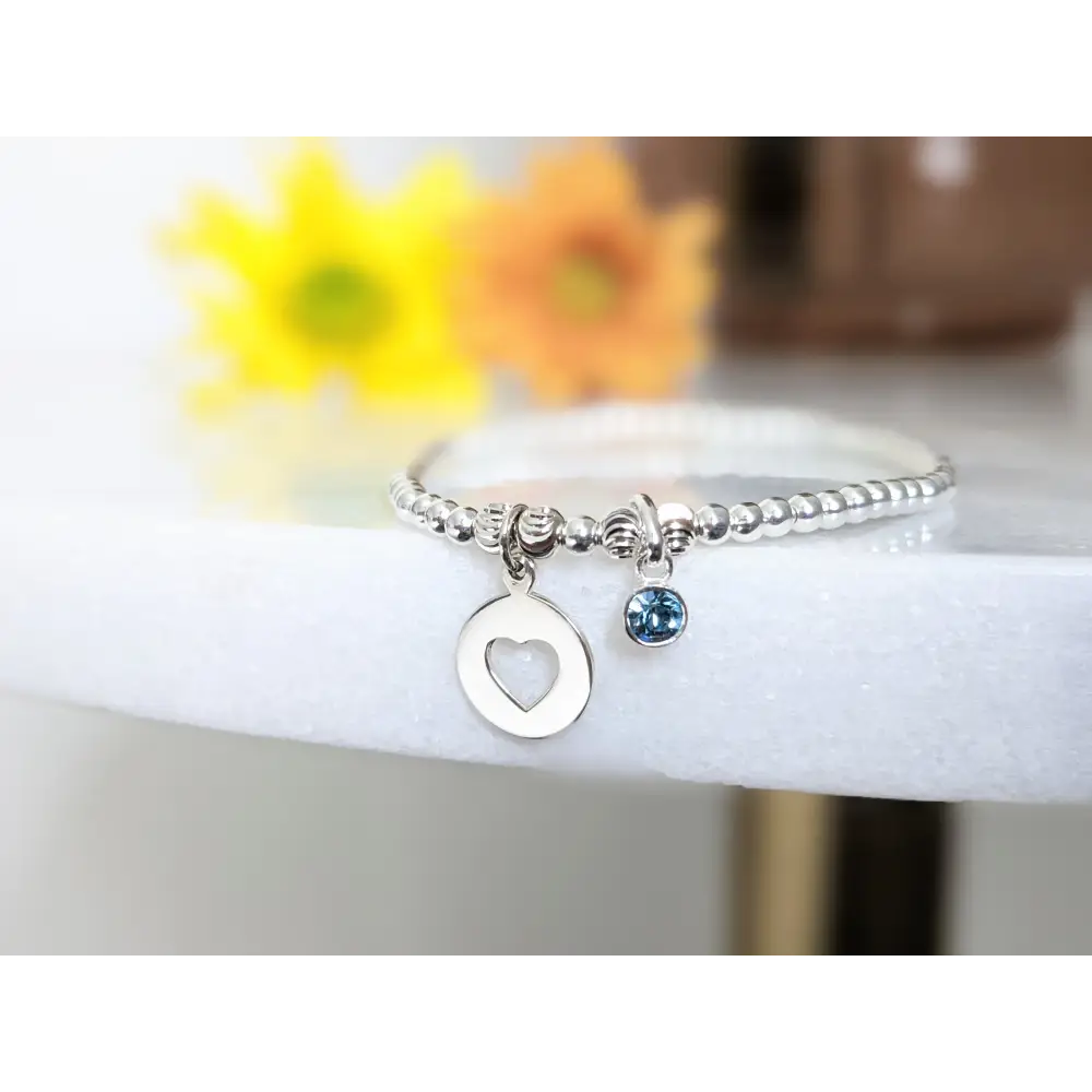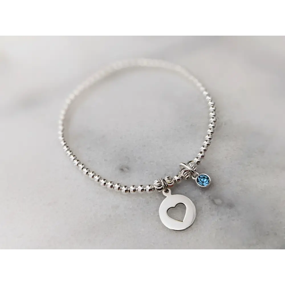 This beautiful bracelet is meticulously crafted with shimmering sterling silver 3mm beads, complemented by a delicate sterling silver cut out heart charm. At its center, a vibrant birthstone gem is securely nestled in a polished sterling silver setting, adding a personal touch and a pop of color.