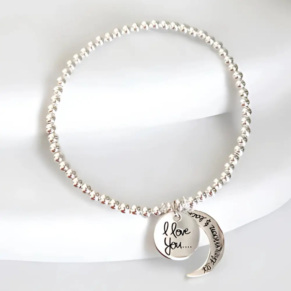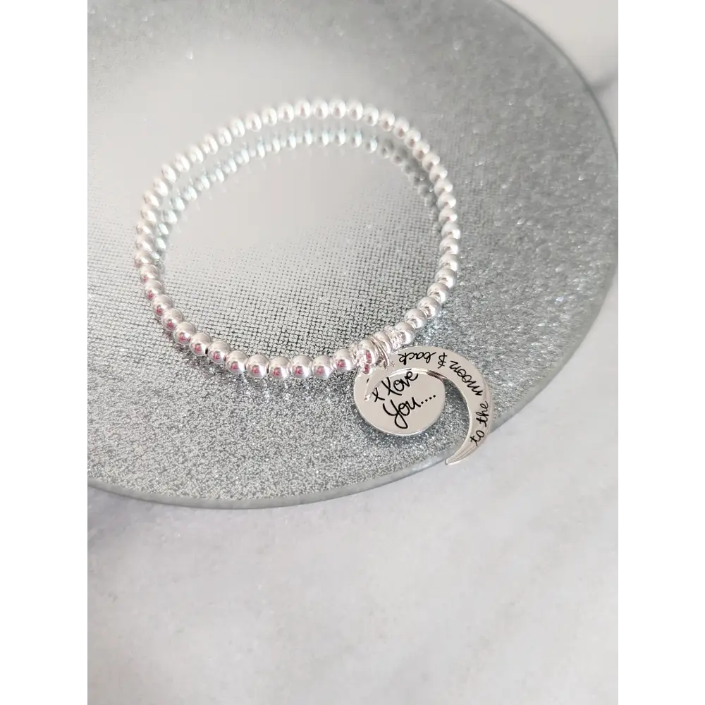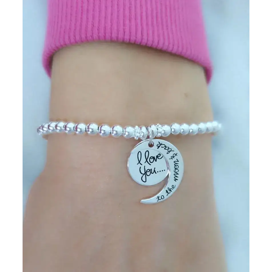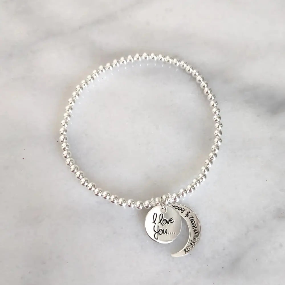 This stunning, sterling silver, 20mm 'I Love You To The Moon & Back' charm bracelet is a beautiful way to express your affection. Crafted with durable, professional-grade stretch elastic and complemented by elegant 4mm sterling silver beads, this charm bracelet offers both style and lasting quality. It's a meaningful piece she'll cherish.