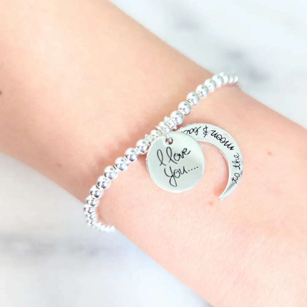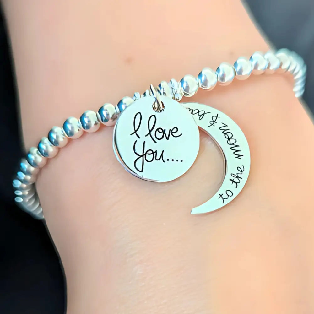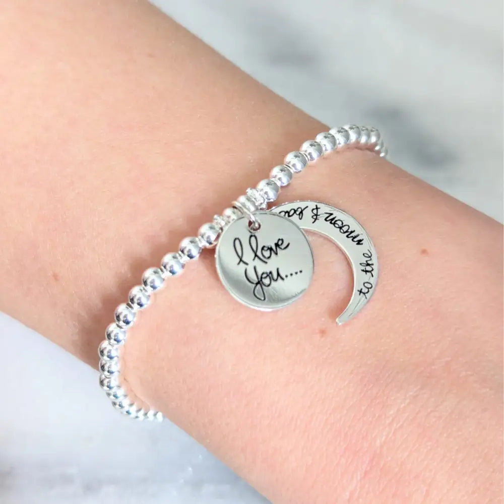 This stunning, sterling silver, 20mm 'I Love You To The Moon & Back' charm bracelet is a beautiful way to express your affection. Crafted with durable, professional-grade stretch elastic and complemented by elegant 4mm sterling silver beads, this charm bracelet offers both style and lasting quality. It's a meaningful piece she'll cherish.