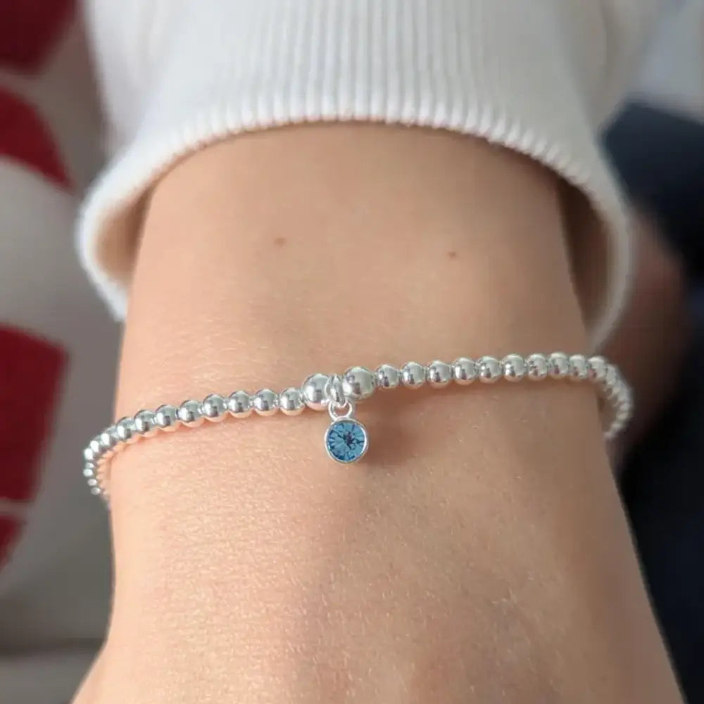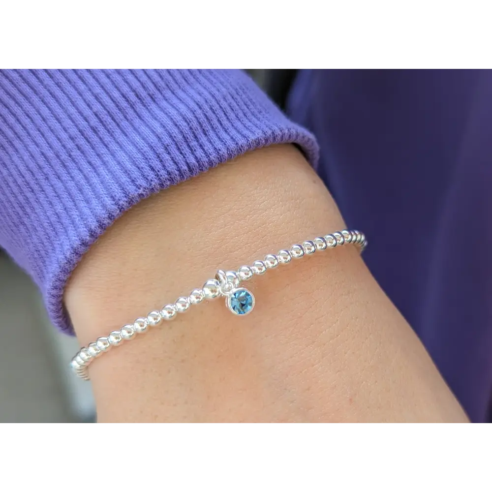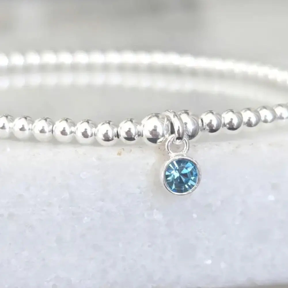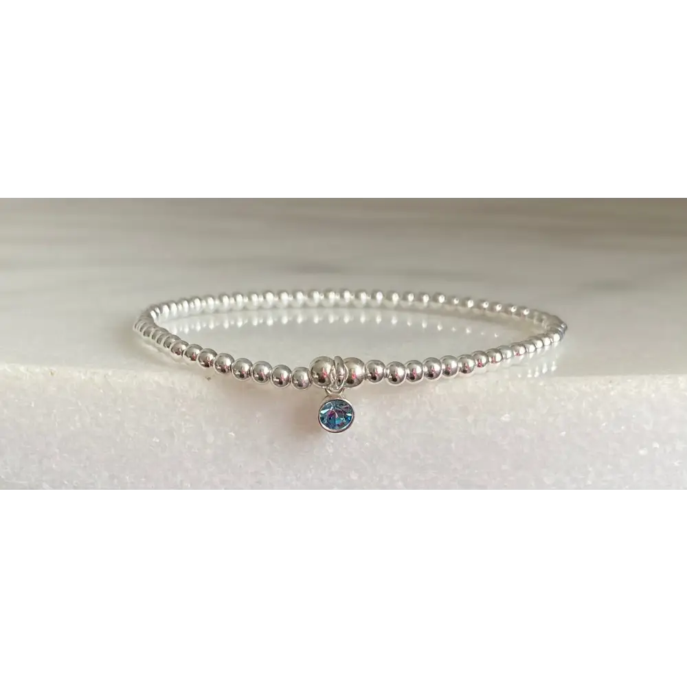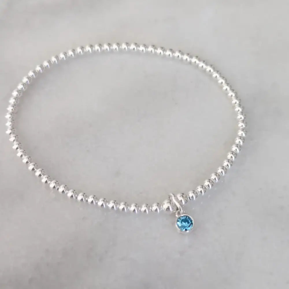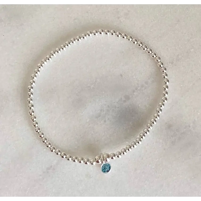 This delicate bracelet is handcrafted using shimmering 3mm sterling silver beads and features a captivating Aquamarine stone, securely encased in sterling silver. It's the perfect silver march birthday gift!