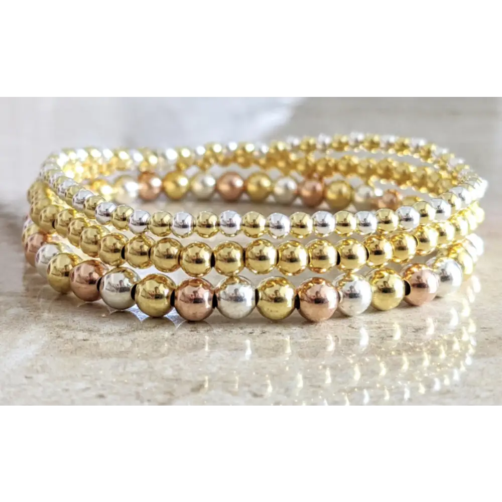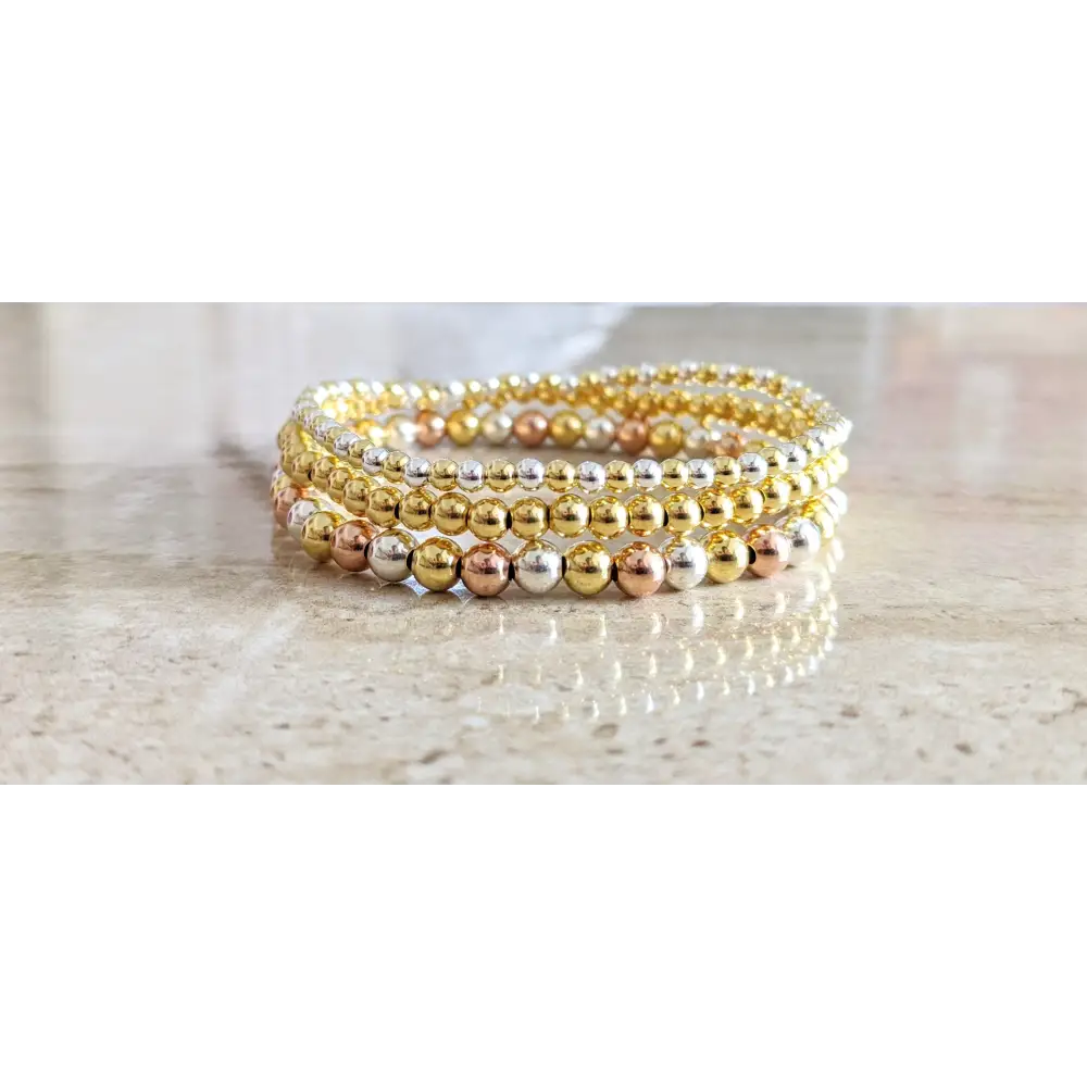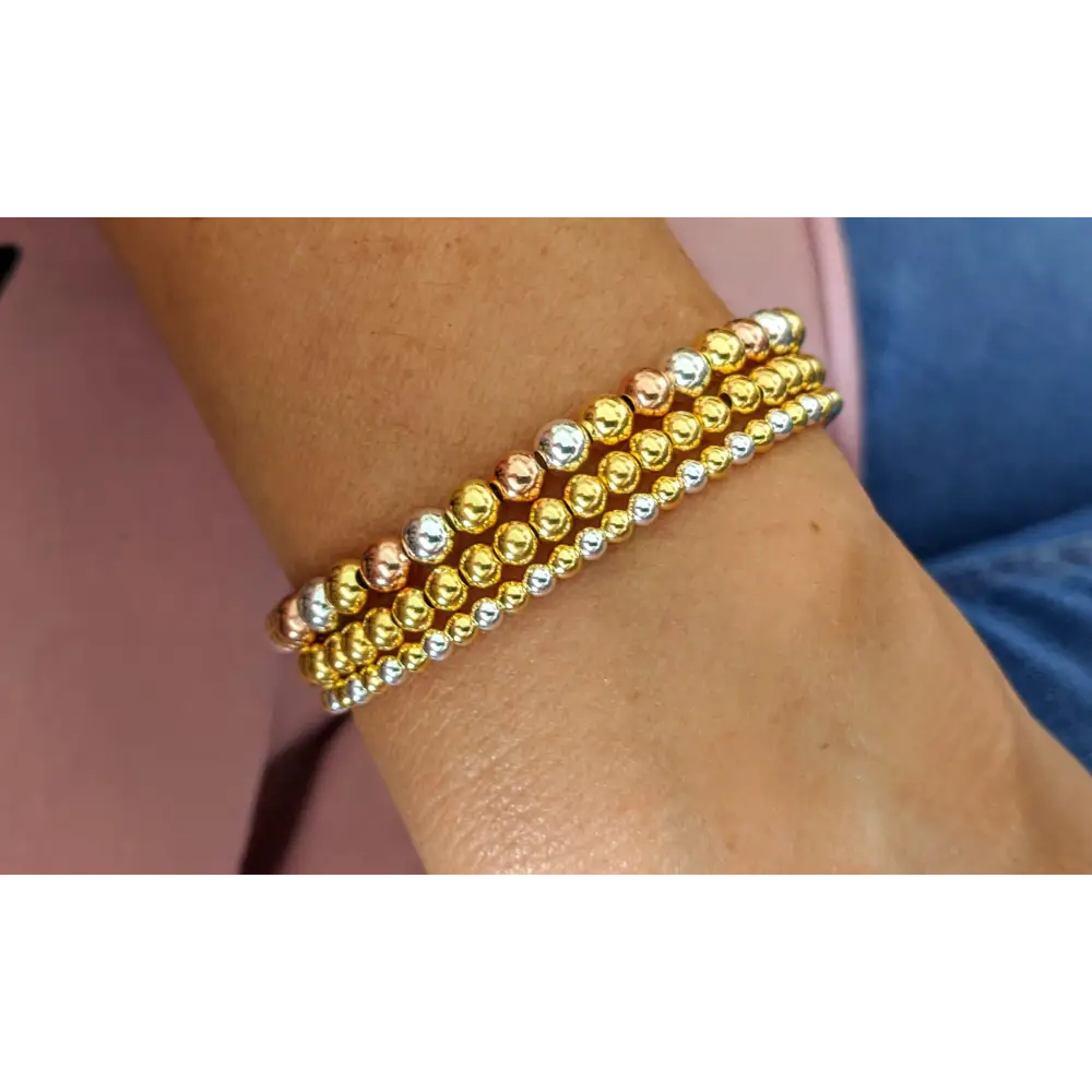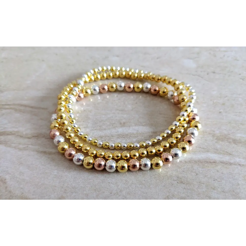 Bracelet 1: This bracelet showcases a delightful mix of 5mm sterling silver, rose gold vermeil, and yellow gold vermeil beads, creating a visually appealing and balanced aesthetic.