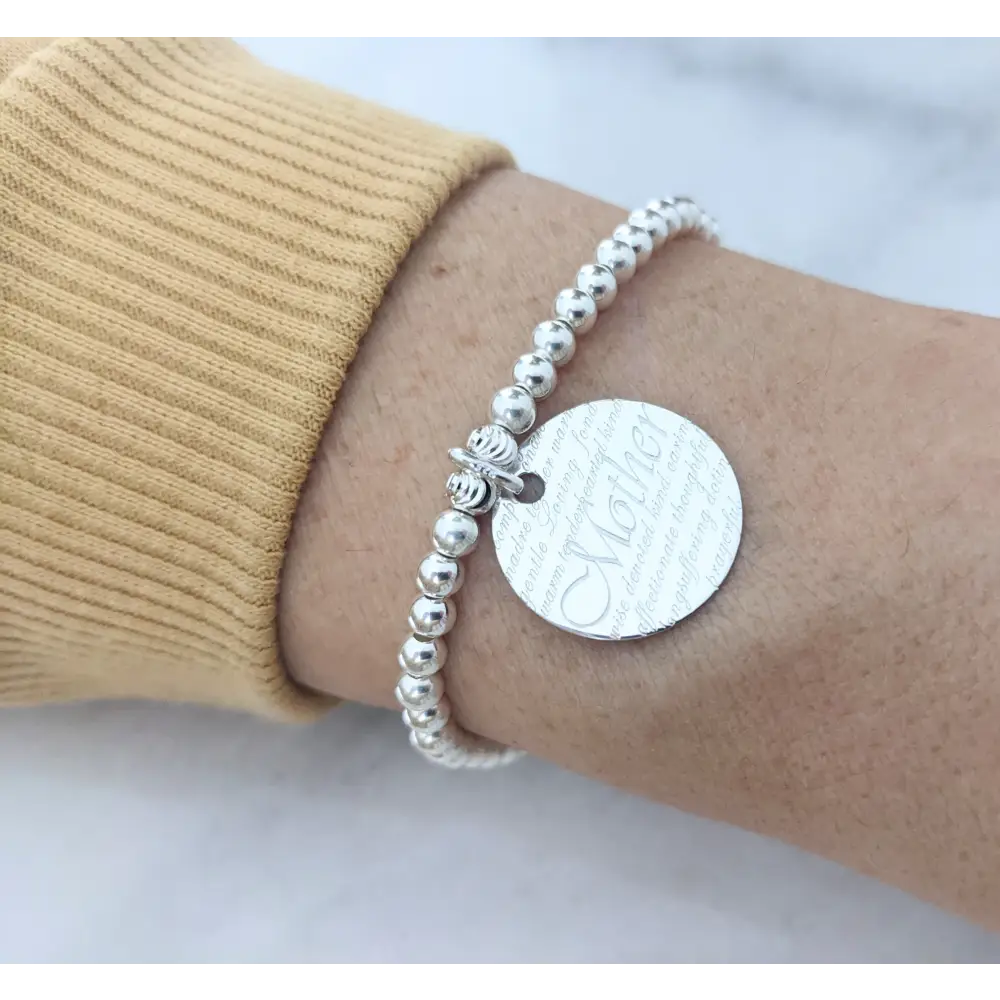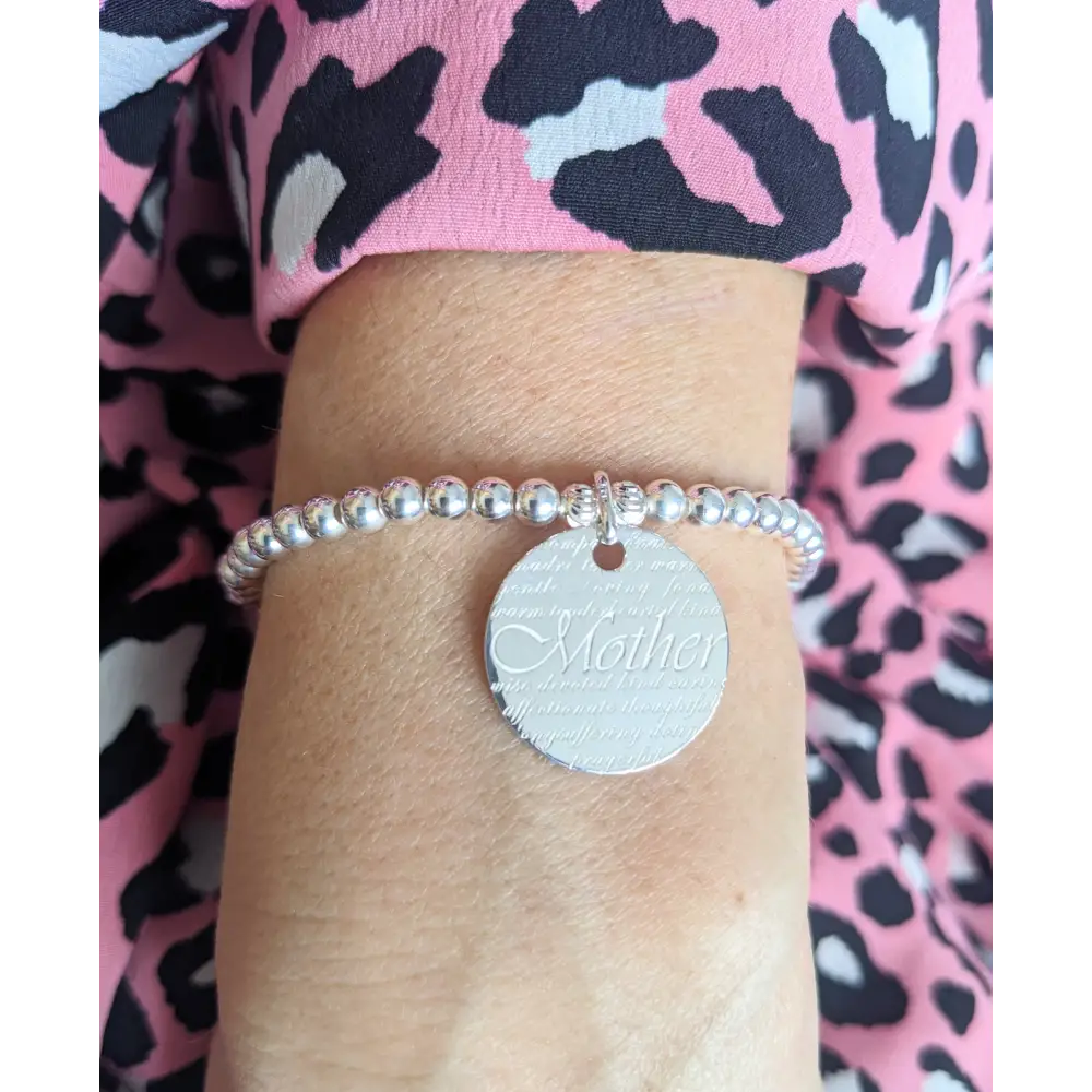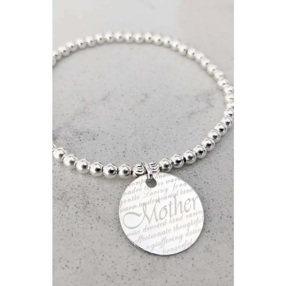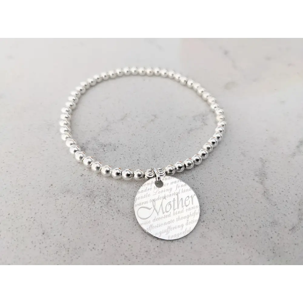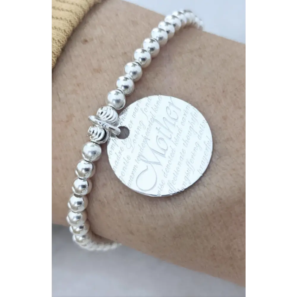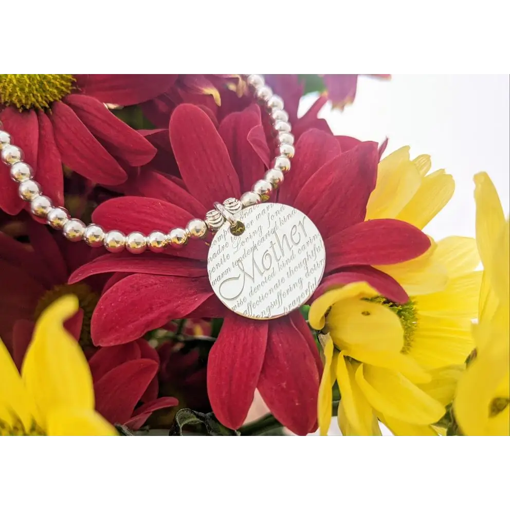 This delicate bracelet features a 20mm sterling silver charm beautifully engraved with the word "Mother" at its heart. Surrounding it are carefully chosen words that capture the essence of motherhood, celebrating all that she is.