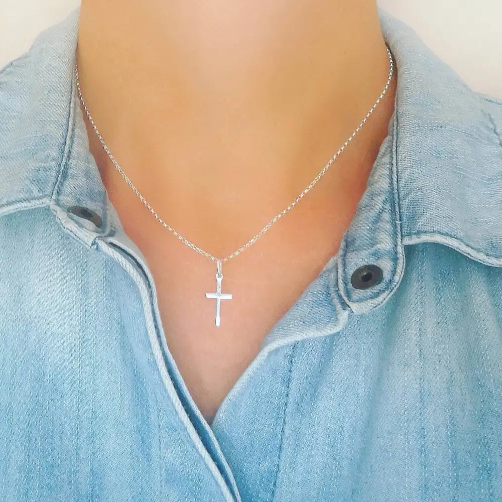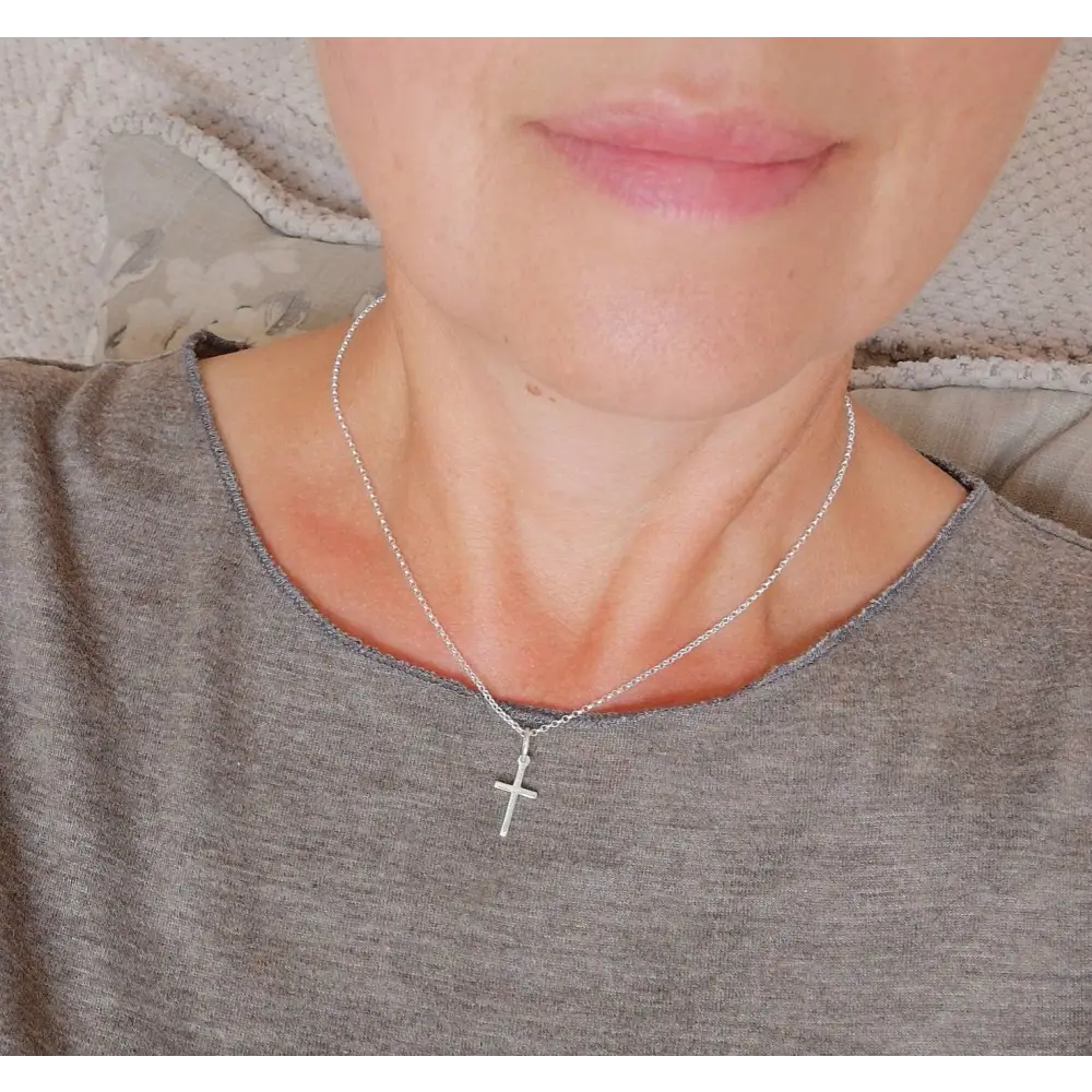 This elegant necklace features a classic 18mm plain sterling silver cross, a timeless symbol crafted from high-quality sterling silver. The smooth, polished surface of the cross reflects light beautifully, making it a subtle yet striking piece.