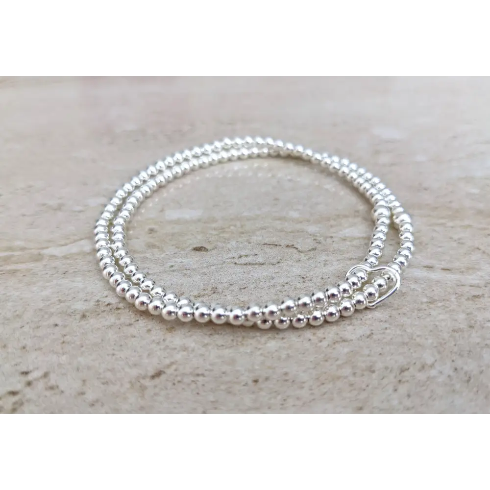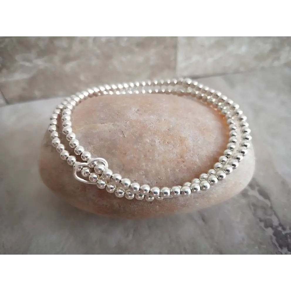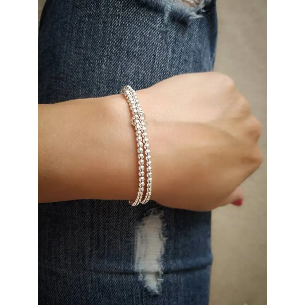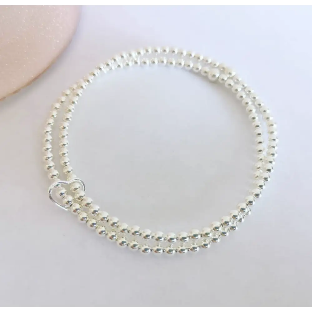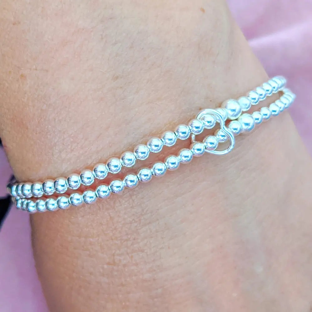 These delicate bracelets feature shimmering 3mm sterling silver beads, creating a timeless and elegant look. Crafted with genuine sterling silver beads, both bracelets are connected by a charming 13mm heart link, stamped with '925' to assure its quality and purity. This double heart bracelet design makes it a meaningful gift for someone special or a beautiful treat for yourself.