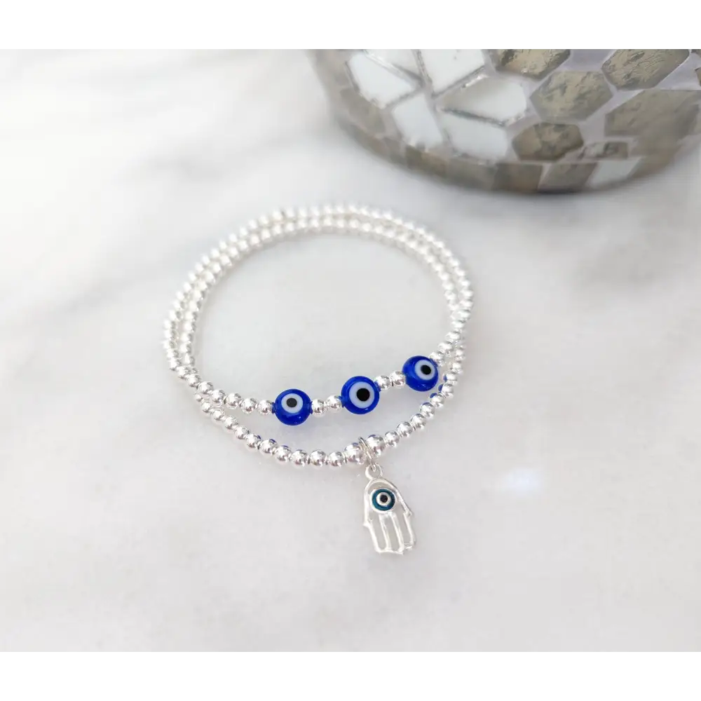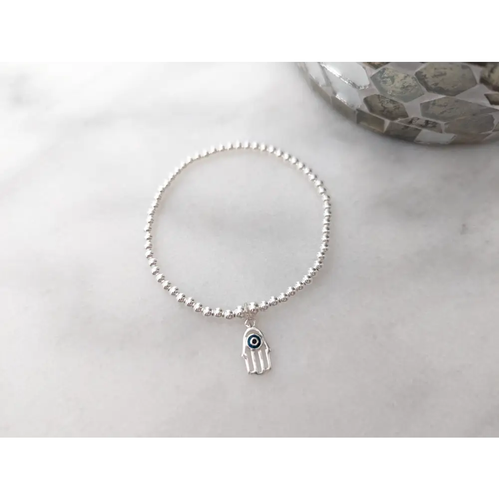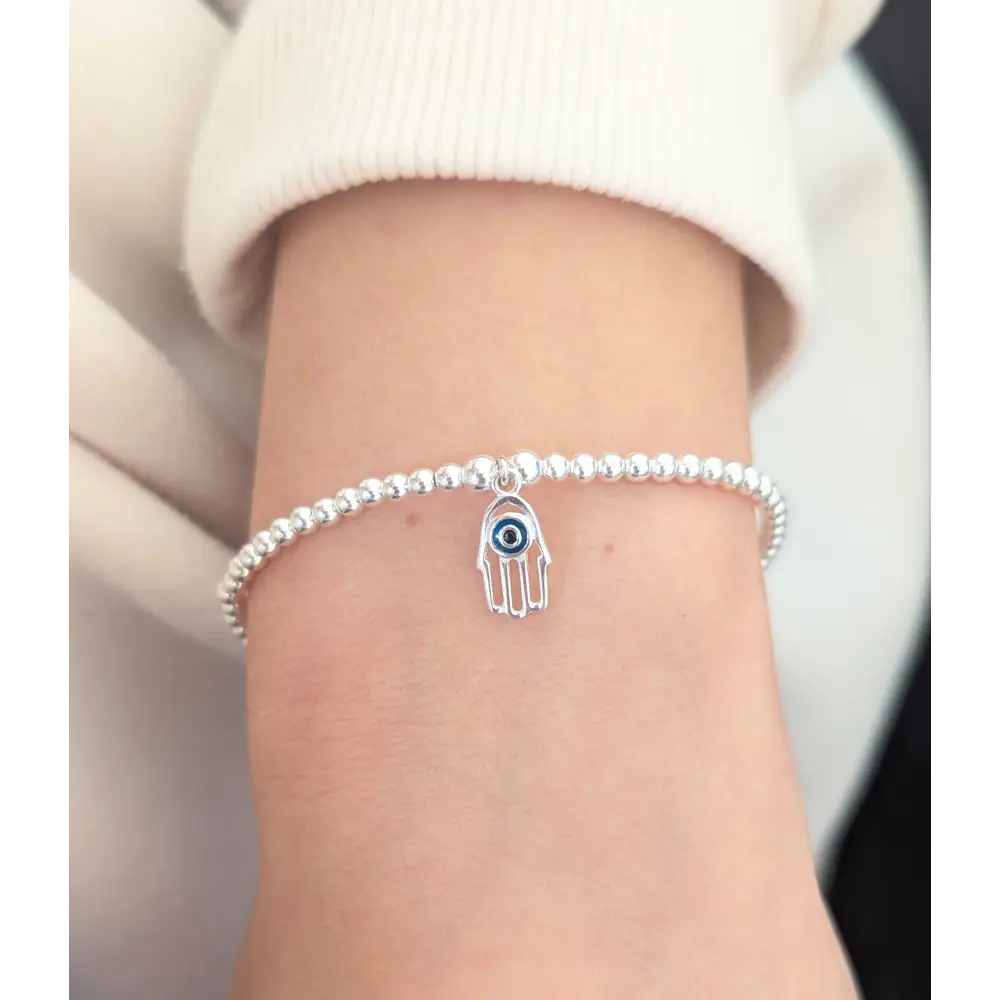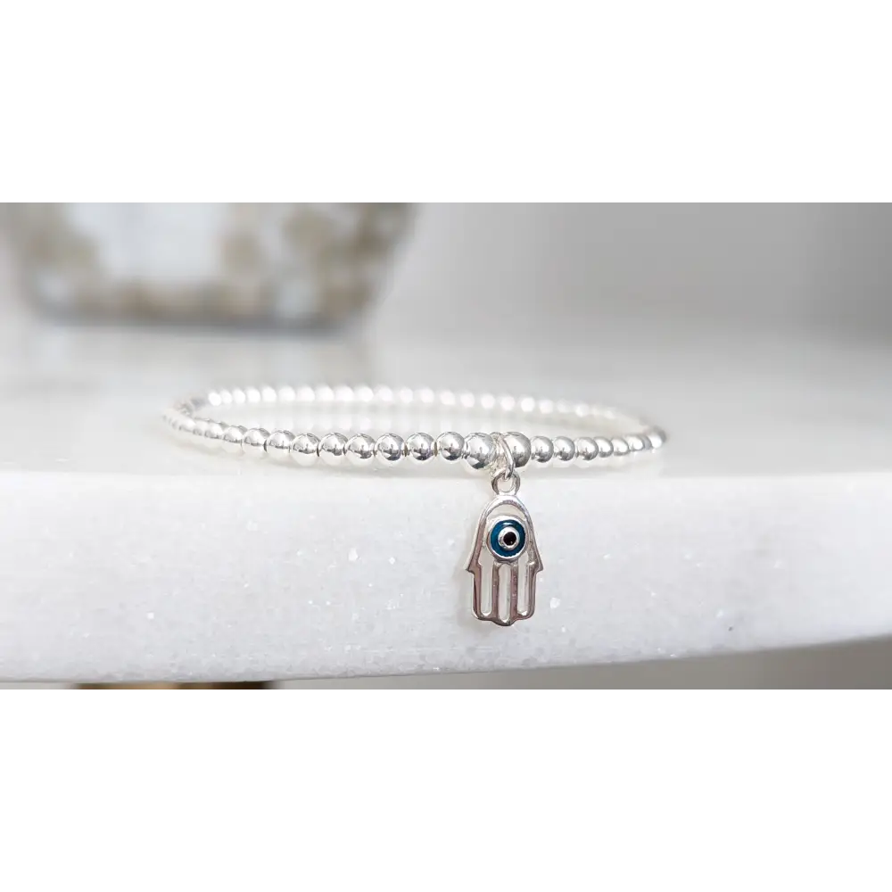 This hamsa hand bracelet is meticulously crafted using 3mm and 4mm sterling silver beads, ensuring both durability and a refined aesthetic. The carefully selected beads contribute to the bracelet's comfortable feel and sophisticated look, making it suitable for everyday wear or special occasions.