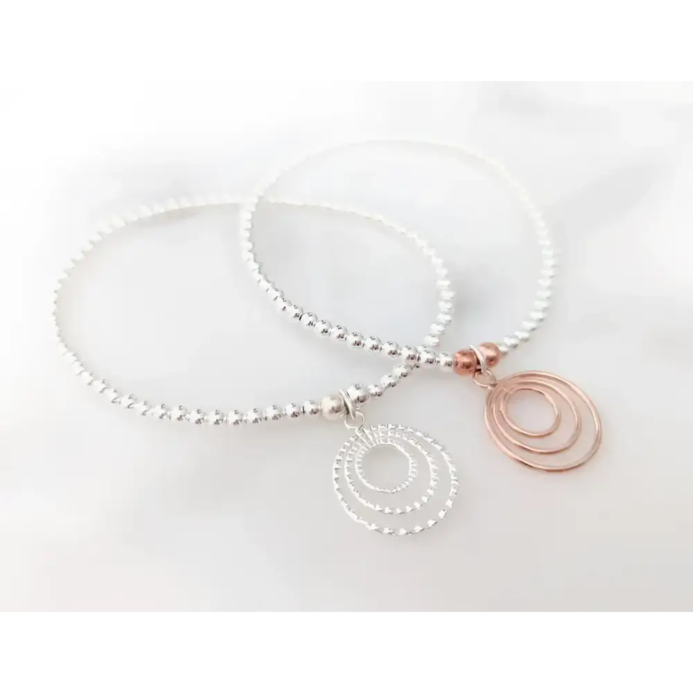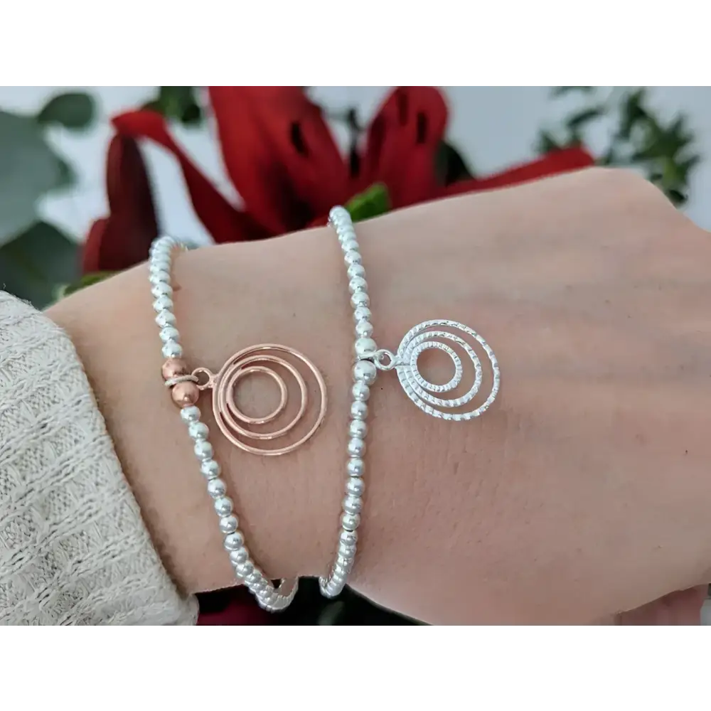 A stunning sterling silver & rose gold beaded bracelet with a 16mm rose gold, 3 rings charm.