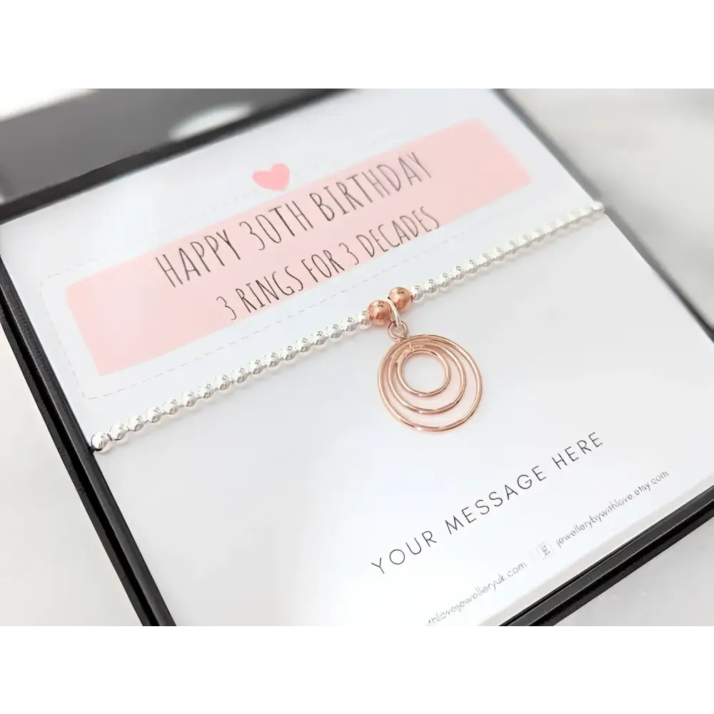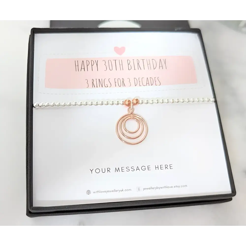 Your bracelet will arrive to you gift wrapped in tissue paper and gift boxed, with the relevant card to explain the rings. You will receive the standard `3 rings for 3 decades' etc card, unless you opt for a personalised message card when placing your order. Please add your message as a note when checking out.