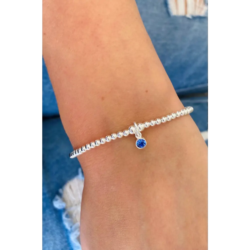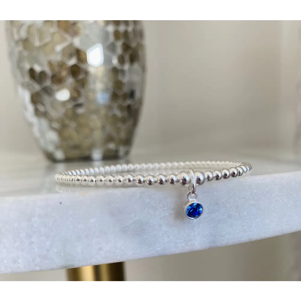 This elegant September birthstone bracelet features delicate 3mm sterling silver beads, meticulously strung to create a comfortable and stylish piece. At its heart lies a Sapphire style stone, securely encased in a sterling silver setting, adding a touch of timeless beauty.