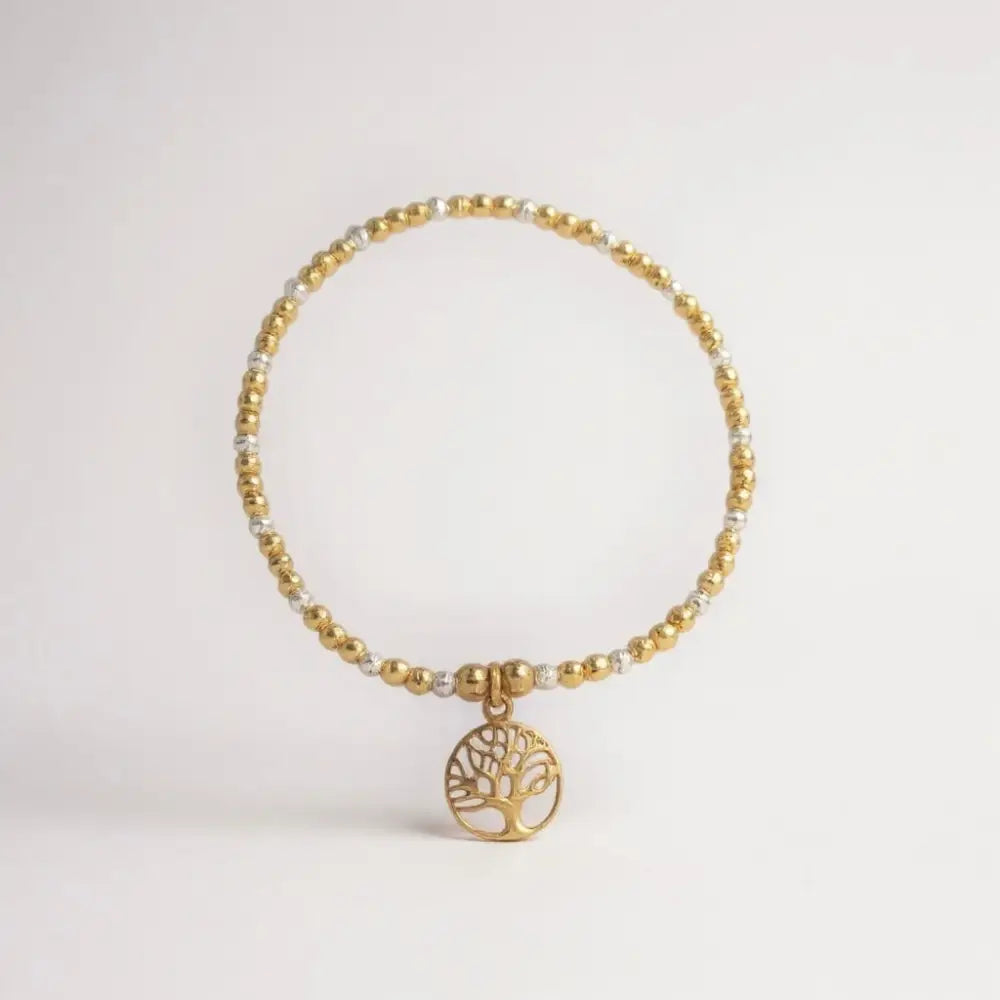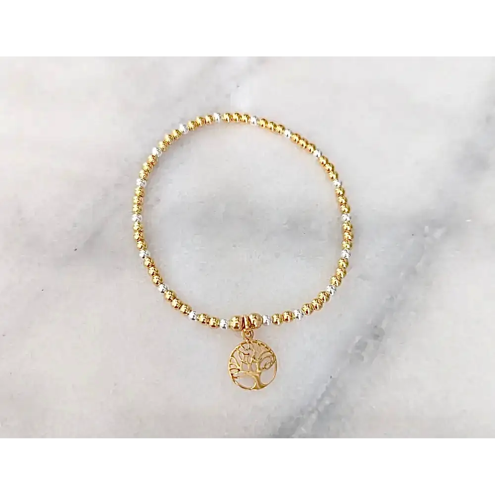 This beautiful tree of life charm bracelet features a delicate blend of 3mm gold vermeil and sterling silver beads, creating a stunning and versatile piece. The contrasting metals offer a subtle shimmer and complement any style.